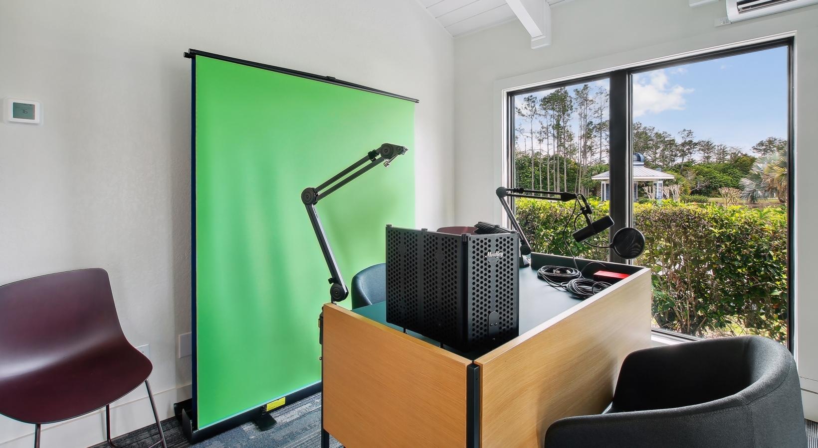 • media room with green screen and microphones
