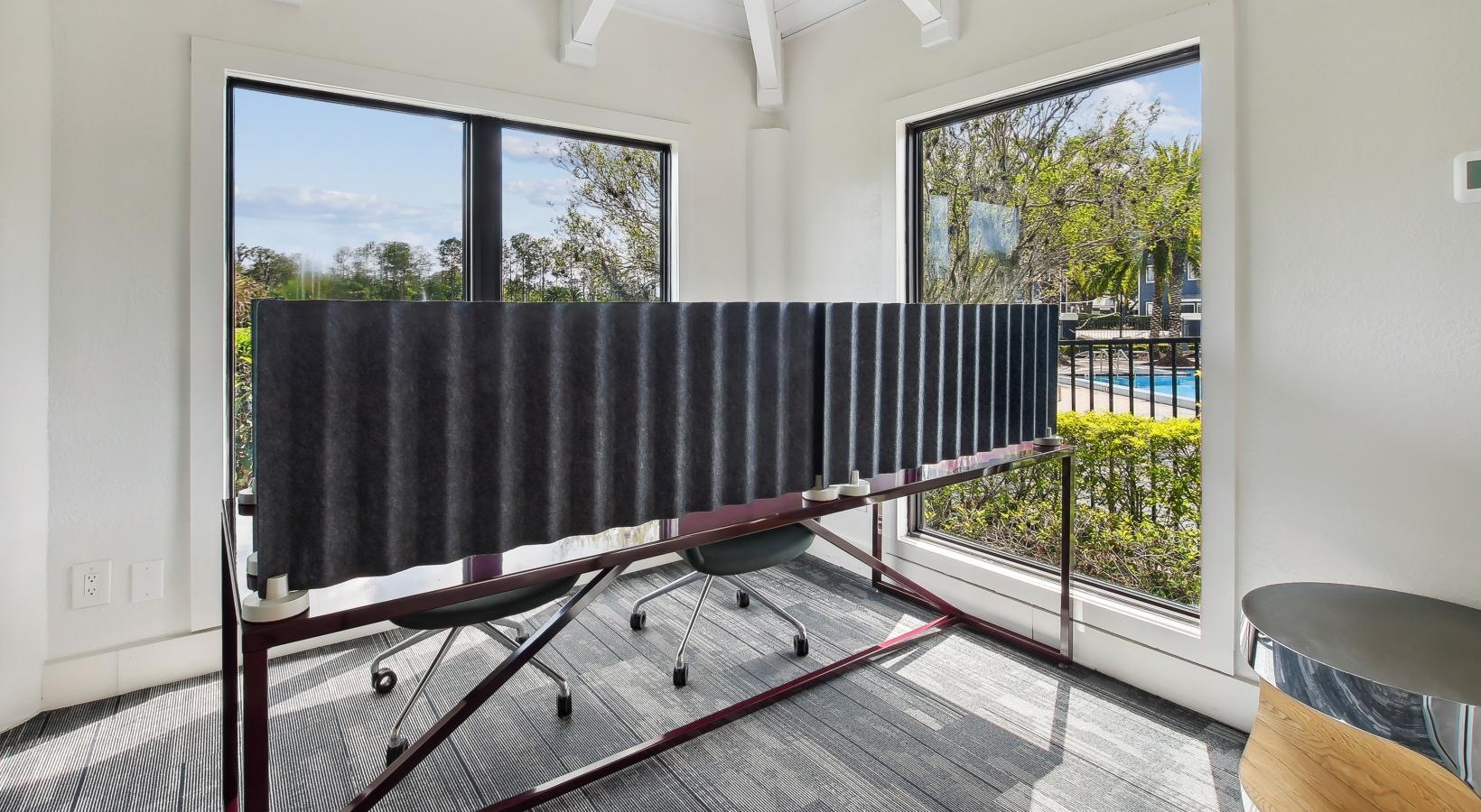 • work stations with chairs and privacy screen