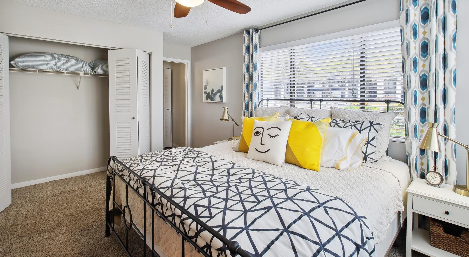 • a bedroom with a bed and a fan